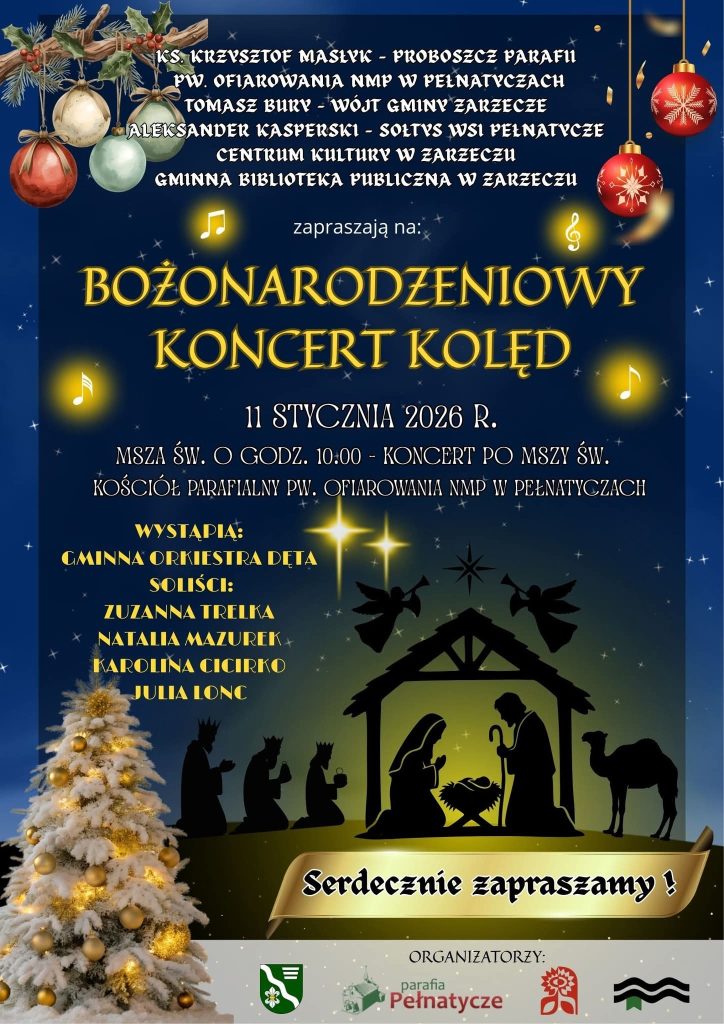 W imieniu Organizatorów serdecznie zapraszamy na Bożonarodzeniowy Koncert Kolęd, który będzie miał miejsce w naszym kościele parafialnym 11 stycznia 2026 roku. Zapraszamy na Mszę św. o godzinie 10:00, a po Mszy świętej na uroczysty koncert, podczas którego wystąpi Gminna Strażacka Orkiestra Dęta oraz solistki: Natalia Mazurek, Zuzanna Trelka, Karolina Cicirko oraz Julia Lonc.